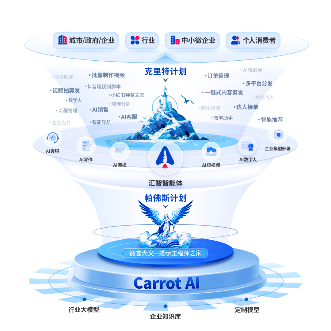 AI 现在所处的阶段是一个探索期,它的创意性非常重要,就是说 AI 如何商业化运用。我们一直在和客户去谈这个问题。在这个过程中,我们清晰了我们的核心产品定位,就是让 AI 成为每个人的天赋,也就是我们最核心的产品——提示工程师之家。