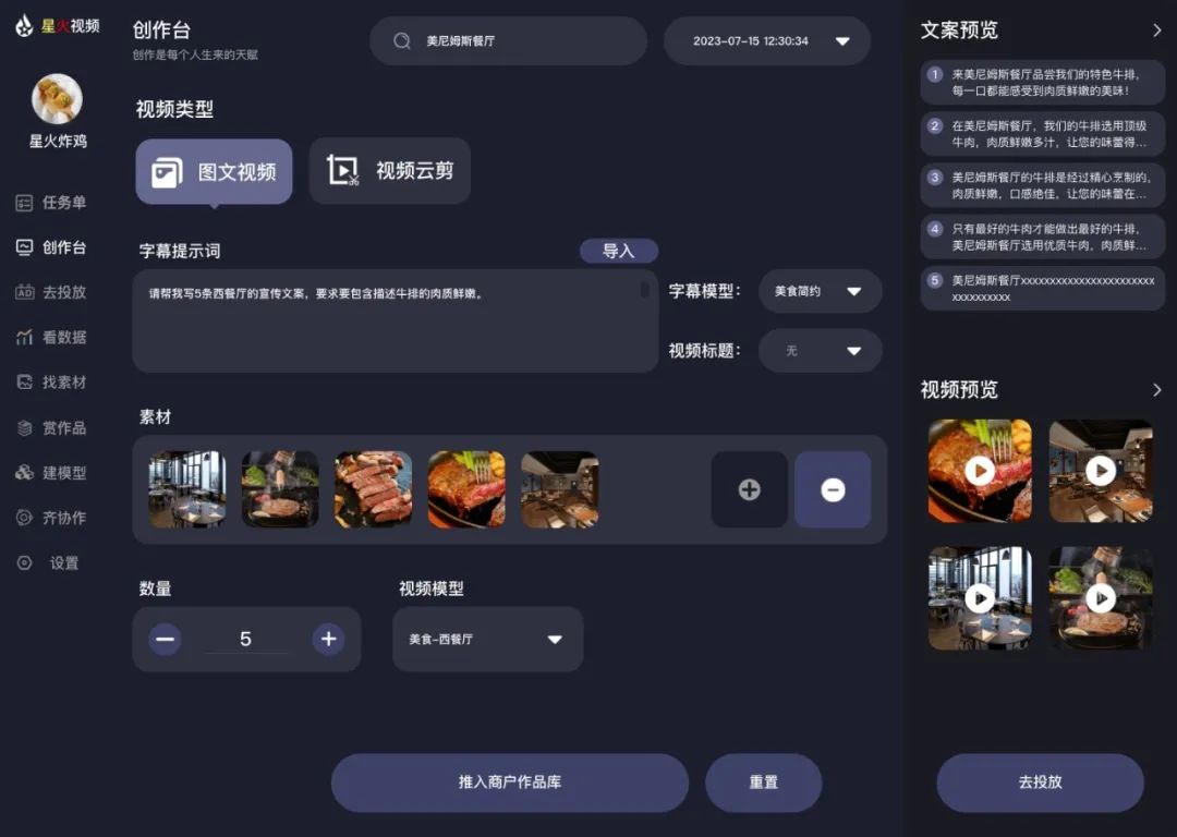 第二部分就是上传图片或者是视频素材,素材不需要用户进行切割。这两个描述通过我们做的 AI 工具,就可以输出几百条短视频,而且是不重复的,因为图片的处理、文案的处理、图文的结合,脚本、转场特效全部是自动化的。