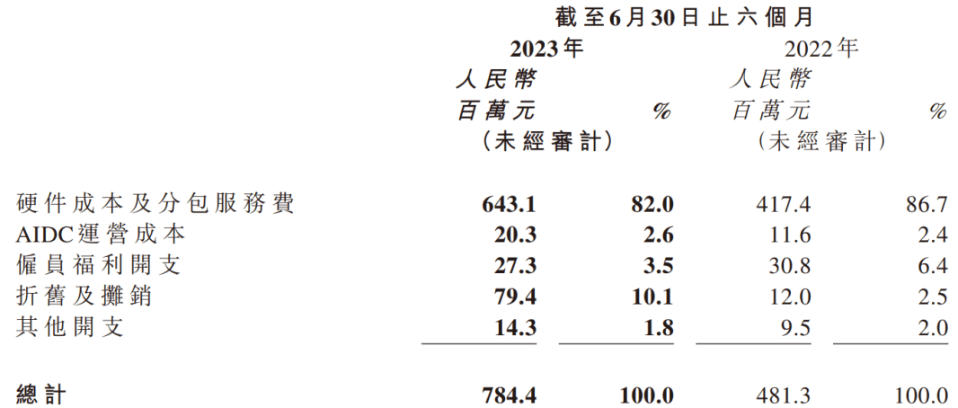 虽然商汤营收微增,但期内销售成本却大幅增长近63%,达到7.84亿元;其中占比达82%的硬件成本及分包服务费同比增长54%,另外两块成本——AI数据中心(AIDC)运营和折旧摊销成本也均分别暴增75%、562%。