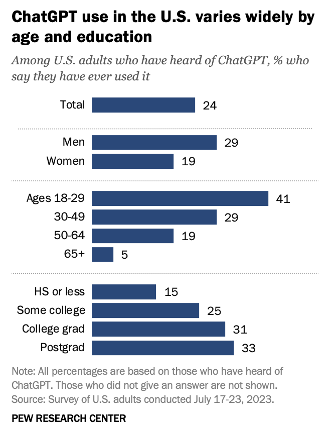 https://www.pewresearch.org/short-reads/2023/08/28/most-americans-havent-used-chatgpt-few-think-it-will-have-a-major-impact-on-their-job