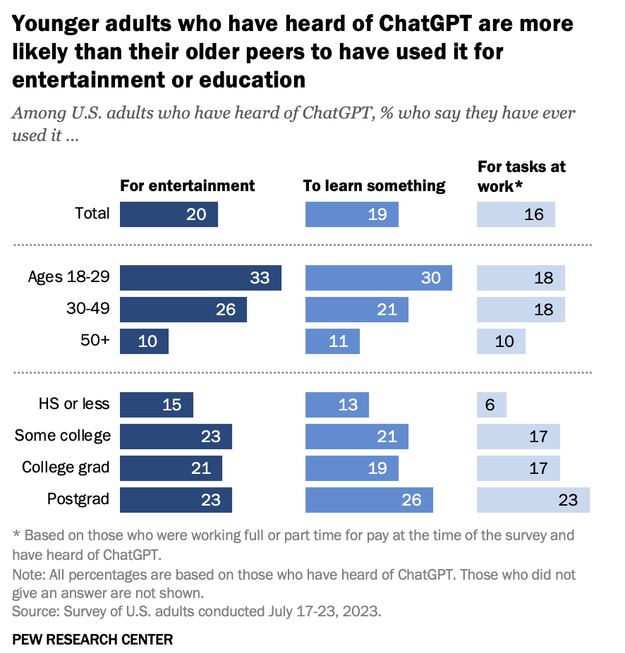 五分之一听说过 ChatGPT 的美国成年人表示,他们曾经用它来娱乐。类似的比例的受访者 (19%) 表示他们用它来学习一些东西,而在听说过该工具并就业的人中,只有 16% 的人表示他们用它来完成工作任务。