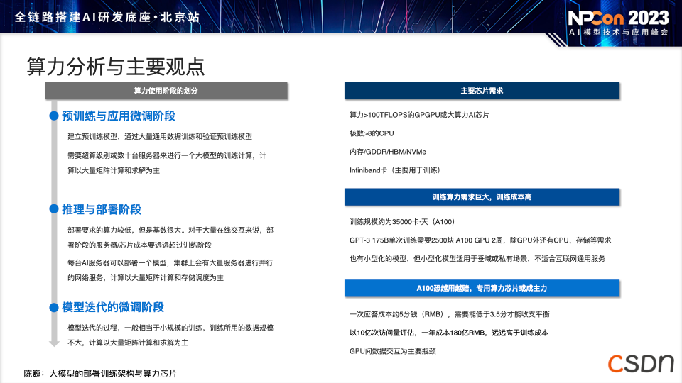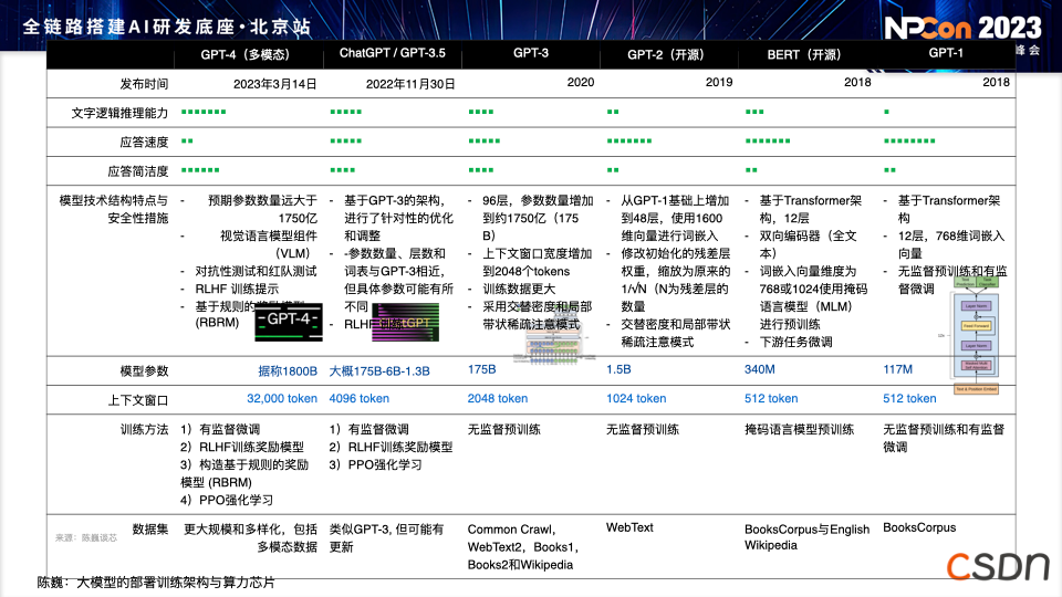 数据量并不是越多越好,过多的数据之间可能导致遗忘效果,以及模型本身在各种冲突信息中学到一些不好的东西。 随着模型的不断增多,许多模型都采用了 Transformer 或类似于 LLaMA 的架构,模型的同质化现象愈发常见。 大模型部署和训练对芯片的算力和存力提出了很高的要求,AI 界由于大模型第一次受到了 CPU 和 GPU 的硬件支撑限制。