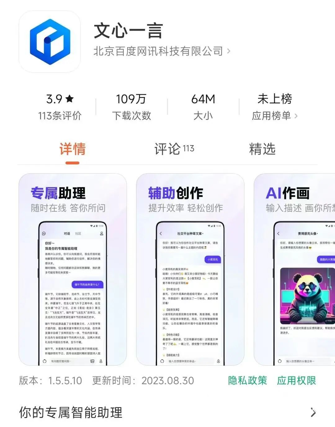 当前,应用商店的文心一言App页面显示其在8月30日更新,下方的宣传语为“你的专属智能助理”。