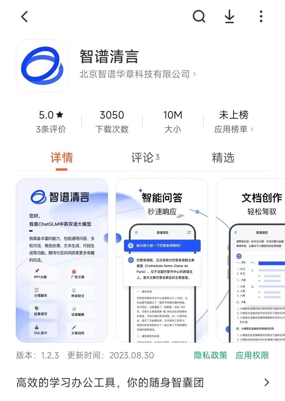 在应用商店中,“智谱清言”于8月30日更新,宣传语提及“高效的学习办公工具”。