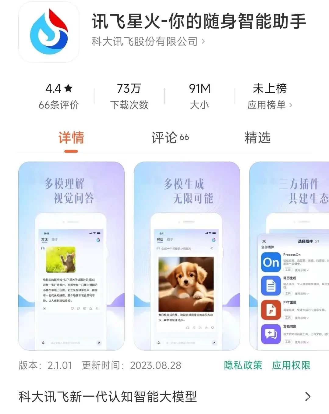 目前,应用商店已有“讯飞星火”App上架,更新时间为8月28日,宣传语为“科大讯飞新一代认知智能大模型“。