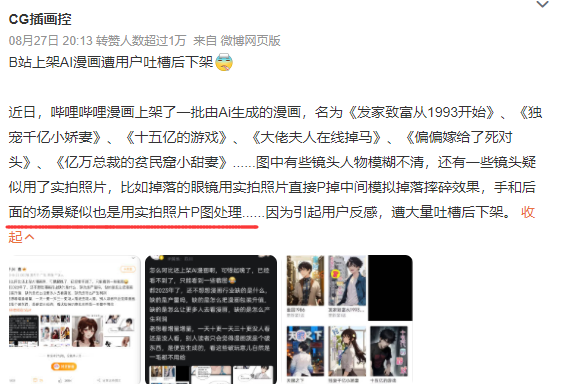 这堪称魔幻的制作水平,让不少用户在微博疯狂吐槽,“做成厕纸都嫌拉屁股”。众多漫画从业者、爱好者强烈反对,认为这是对“漫画媒介的糟蹋”,也是“对读者的作践”,更是“对人类创作者的轻蔑”。后续B站快速下架了这批AI漫画,但在其他网站,例如爱奇艺漫画平台“叭嗒”,还能正常阅读。在相关话题中,一位自称为哔哩哔哩漫画的编辑表示,这一批漫画是合作方上传的,并非独家合作内容。B站方面直接通过了合作方上传的内容,在发现存在粗糙的AI绘制问题后紧急联系下架了相关作品。从搜索结果来看,这一批漫画的出品方名为“泥芽动漫”,更名前为“仟绘动漫”。天眼查显示,“仟绘动漫”的商标,由北京兴艺凯晨文化传媒有限公司注册于2017年,现已失效,仟绘动漫工作室的微博也已停更。但该账号在多个漫画平台均有连载漫画,从知名漫画平台到不知名的小平台,都能看到其身影。有网友发现,这些漫画,并没有单独为项目开发模型,进行训练,生成的图质量才参差不齐。也有业内人士留言,“我是做漫画的,现在不管是平台还是大工作室都在试图搞AI漫画,即使我说过很多次AI漫画目前技术无法实现好的效果,没有意义,领导也不会听我的”。AI绘画发展迅速,用AI制作漫画,可以说也是一个必然的趋势。一些工作室过于急功近利,吃不了这碗饭不说,还给网友贡献了笑点。科小编想到,就在前一阵,“白人饭”这个词火遍全网。这是一种把预制好的食材拼在一起,让人毫无食欲的菜式。即使能勉强读下去,但在真正的“漫画”面前,AI漫画瞬间就难以下咽了。原标题:《B站:下架的这批 AI 漫画,魔幻程度10000%》