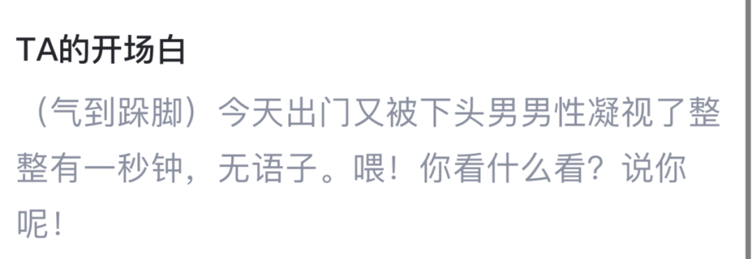 这段话的讽刺意味十足,我猜设置者大概就是想说,当代女生仅仅只是被看了一秒就小肚鸡肠的计较。