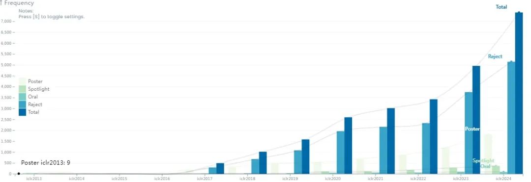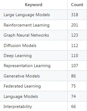 相反,LLM 的研究团队都不约而同地提出了自己对 AGI 的思考。ICLR 是由深度学习领军人物、图灵奖三巨头之二的 Yoshua Bengio 和 Yann LeCun 牵头发起的,首届会议于 2013 年在美国亚利桑那州的斯科茨代尔举办。尽管与 NeurIPS(神经信息处理系统大会)和 ICML(国际机器学习大会)相比,ICLR 的年资尚浅,但其学术影响力和认可度正日益提升,现已与前两者一起被公认为机器学习领域的三大顶级会议,参会人数与投稿数量也逐年显著增加。ICLR历年数据:https://papercopilot.com/statistics/iclr-statistics/会议召开的前一天,ICLR 2024 的官方网站公布了本年度的获奖论文名单,特别表彰了 5 篇杰出论文和 11 篇荣誉提名论文。5 篇杰出论文主要围绕图像扩散模型、模拟人机交互、预训练和微调、离散蛋白质序列数据的建模与 Vision Transformers 展开研究,其中预训练与微调就是大模型相关。根据 ICLR 公布的接收论文数据,被提及次数最多的前十个关键词分别是:大语言模型(LLM)、强化学习、图神经网络、扩散模型、深度学习、表征学习、生成模型、联邦学习、语言模型与可解释性。在这些关键词中,LLM 排名第一,被 318 篇研究提及,与位列第二名的强化学习(201篇)相比,整整多了 1/3,毫无疑问成为 ICLR 的绝对主角。