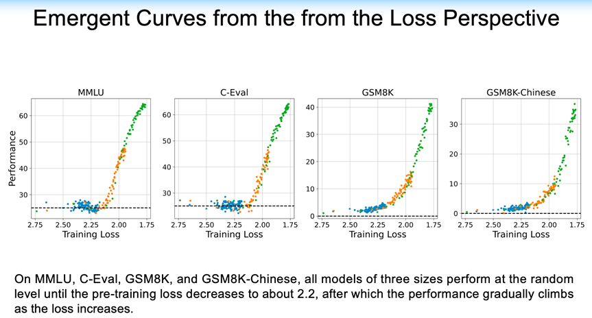 从2019 年开始,智谱的大模型研究以“认知”(Cognition)为核心,借鉴人类思维,将模型的能力研发分为负责快速直觉的“系统 1”与负责慢速逻辑的“系统 2”。这借鉴了 Yoshua Bengio 最早提出的“System 1”与“System 2”理论。智谱的思考是:系统 1 以 LLM 为核心,能迅速响应简单问题;系统 2 则采用知识图谱构建,能处理复杂的推理任务,建立短期和长期记忆,还具备无意识学习和自我管理等功能。这是为了让计算机程序能像人类运用左右脑一样,既能快速回答简单问题,又能通过推理回答复杂问题。此外,智谱的 GLM 大模型采取双向自回归路线,而 OpenAI 的 GPT 系列采取单向自回归路线。双向自回归的特点是:在生成 token 时,GLM 可以只关注单侧的上下文;在采用随机化的 token 控制策略处理已知 token 时,GLM 又能同时考虑两侧的上下文,实现对单向和双向注意力机制的双重管理。这相当于将 BERT 的填空功能与 GPT 的生成能力相结合,通过自回归的方式做“完形填空”。因此,在某些任务,GLM-130B 的性能能超过 GPT-3。此外,智谱的大模型技术团队还认为,人类大脑具有多模态的感知与理解能力,以及短期和长期记忆能力以及推理能力的组合。因此,视觉语言模型(VLM)也是通往 AGI 不可缺少的一环。CogVLM 就此诞生。这是一个开源的图像理解模型,旨在弥合 LLM 与视觉编码器之间的差距。通过将文本信息与视觉编码相结合,并对该组合模块进行训练,CogVLM 实现了文本与图像间精确的映射,极大地提升了模型对视觉内容的理解和生成能力,也被用于 Stable Diffufion 3 的图像标注。技术团队还研发了一个创新级联框架 CogView3。作为第一个在文本到图像生成领域实现级联扩散的模型, CogView3 在人类评估中比当前最先进的开源文本到图像扩散模型 SDXL 性能高出77.0%,推理时间却仅为其大约一半的长度,其蒸馏变体在性能相当的情况下,甚至只需 SDXL 的1/10的推理时间。随着 CogVLM 的加入,GLM-4V 也投入了使用,无论是面对包含世界常识的图片还是需要理解推理的图表,GLM-4V 都能提供言之有物的回复。为了让 GLM-4V 能自动产生不同的功能,如增加长文本的模式以储存长期记忆,或从反馈中不断自我学习完善,GLM 大模型技术团队开发了能为 LLM 启用通用代理(Agent)能力的 AgentTuning。此前,大模型训练是通过输入数据让其不断学习和微调,但这个方法的缺点是它无法推广至其他更广泛的情况。而 AgentTuning 只需用少量案例和有限的标记数据,就可以将训练好的模型推广到不同的模型之中。与此同时,大模型的“涌现能力”同样是智谱技术团队一直在探索的问题。在 LLM 烈火烹油的几年间,Scaling Law 被封为铁律,不少人认为模型大小与训练数据量的增加才能让模型“智能涌现”。OpenAI 科学家 Jason Wei 于2022年在机器学习期刊 TMLR 上发表了论文,提出 LLM 涌现能力中的某些能力仅在大模型中显现,小模型并不具备,因此大模型的新兴能力无法仅凭小模型的性能来预测,而增加模型的规模后,新兴能力自然会呈线性提高。而智谱在不久前发布的研究却提出了一个新的理解:损失(Loss)才是涌现的关键,而非模型参数。将训练损失标为 X 轴、模型性能标为 Y 轴后,研究人员发现,如果训练损失达到了2.2的阈值,模型性能就会攀升。由此可见,模型的“涌现能力”除了与模型大小、训练数据量紧密关联,也可能源自于训练损失。论文地址:https://arxiv.org/pdf/2403.15796.pdf